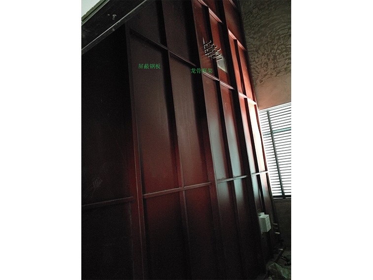 型鋼組成的龍門框架、冷軋或鍍鋅鋼板屏蔽殼體、屏蔽門、通風(fēng)波導(dǎo)窗、電源(信號(hào))濾波器、室內(nèi)電氣及裝飾。